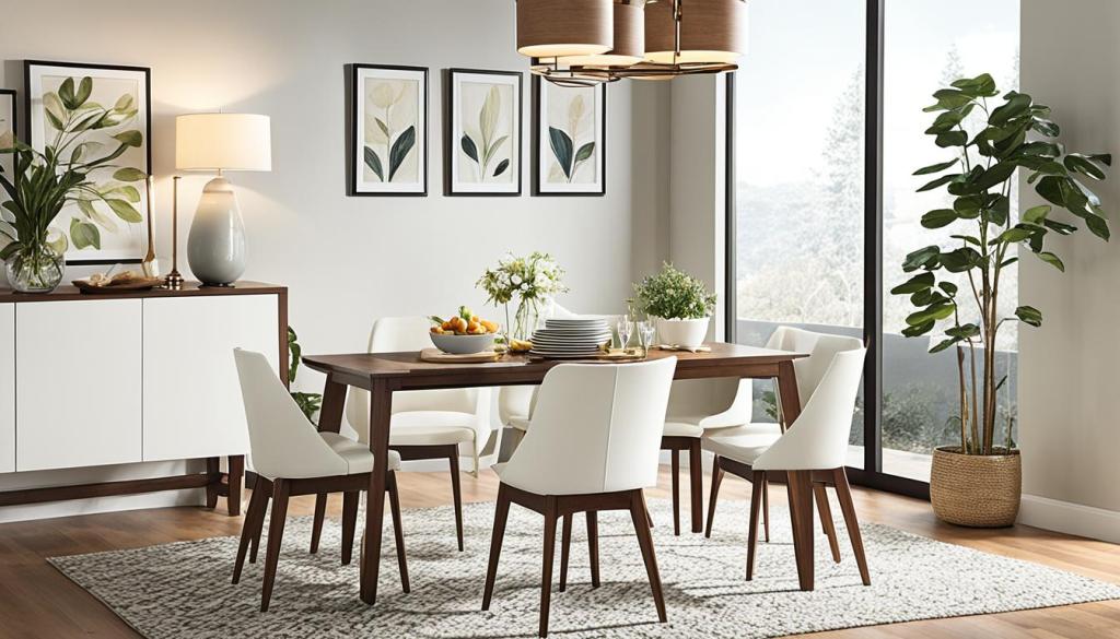 There are many designs to consider. Some blend into your area, while others are bold statements. We’ve talked about different furniture, from space-savers to items with more than one use. These pieces help make dining spots perfect for both coffee in the morning and parties at night. It shows that even small places can be stylish and functional.