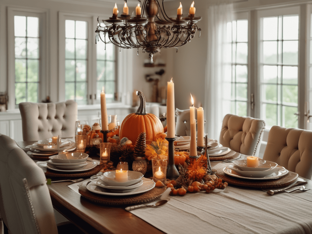 Create a stunning centerpiece that captures the essence of fall. Use natural elements like pumpkins, gourds, pinecones, and acorns. Combine these with candles of varying heights to add a warm, inviting glow to your dining table. A rustic wooden tray can serve as the perfect base for your arrangement, keeping everything organized and visually appealing.