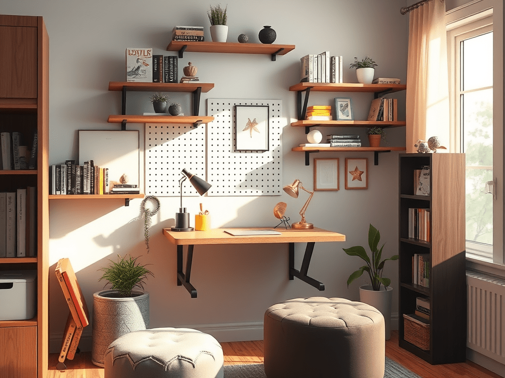 • Wall-mounted Desks: Foldable or wall-mounted desks save floor space and can be tucked away when not in use.