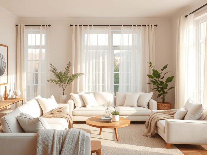 - Linen or cotton curtains in a creamy off-white tone