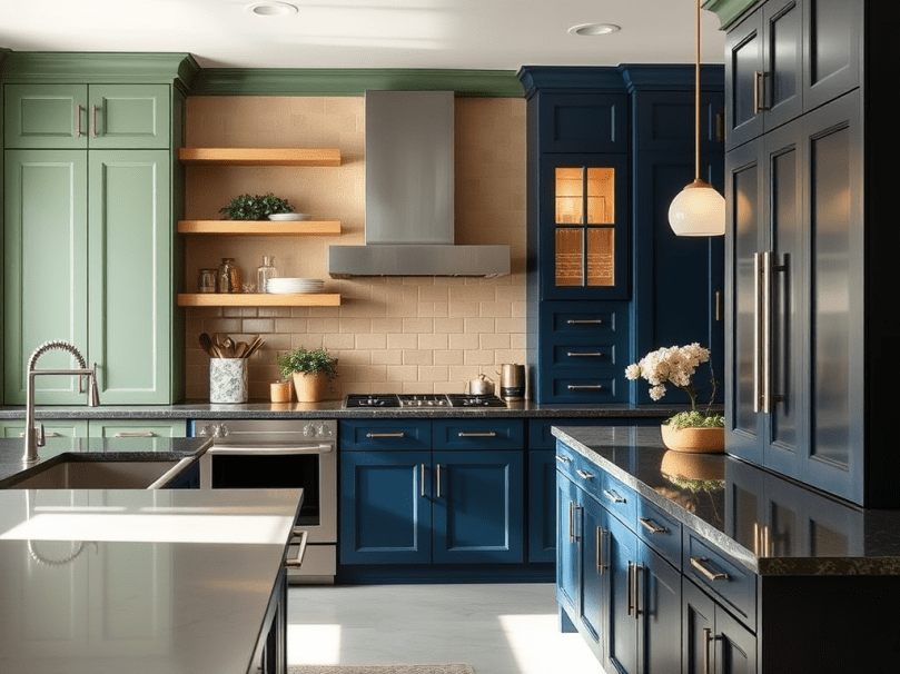 - Two-Tone Cabinets – Mixing colors (such as dark lower cabinets with light uppers) adds depth and interest to your design.