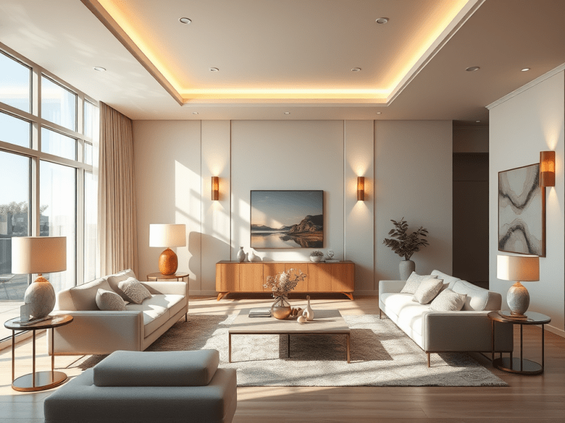 - Ambient lighting – This is your main light source. Use ceiling fixtures, large pendants, or track lighting that evenly illuminates the room. Opt for diffused bulbs rather than harsh spotlights.