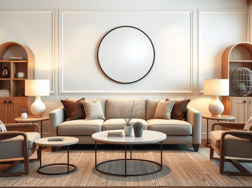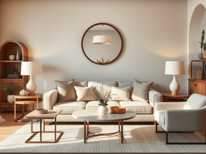 - Living Room: A pale gray sectional with mustard and navy accents.