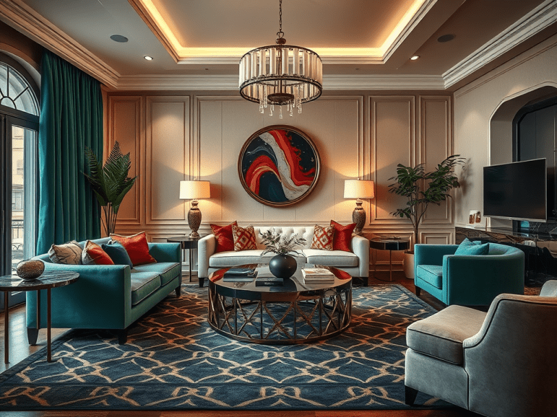 You don’t need to deck out every corner in bold design. Start small—a mirrored coffee table, a geometric-patterned rug, or an accent chair with gold trim.
