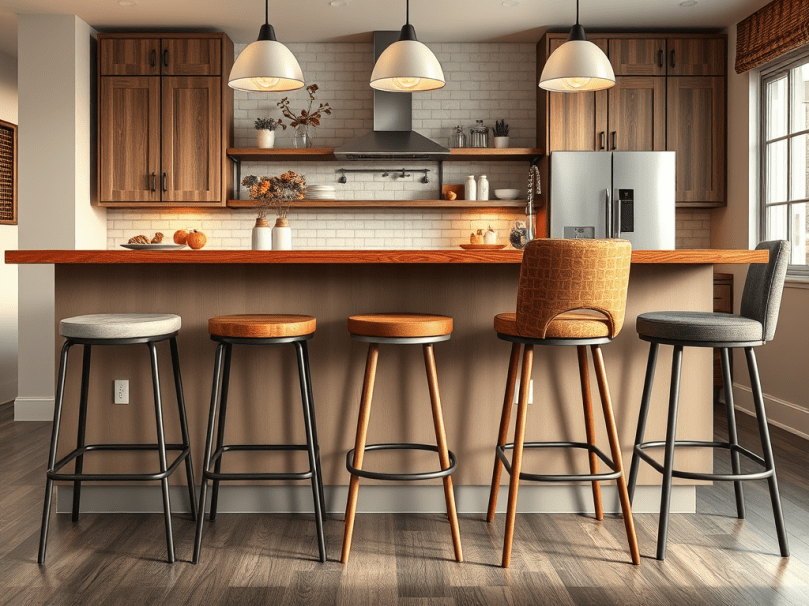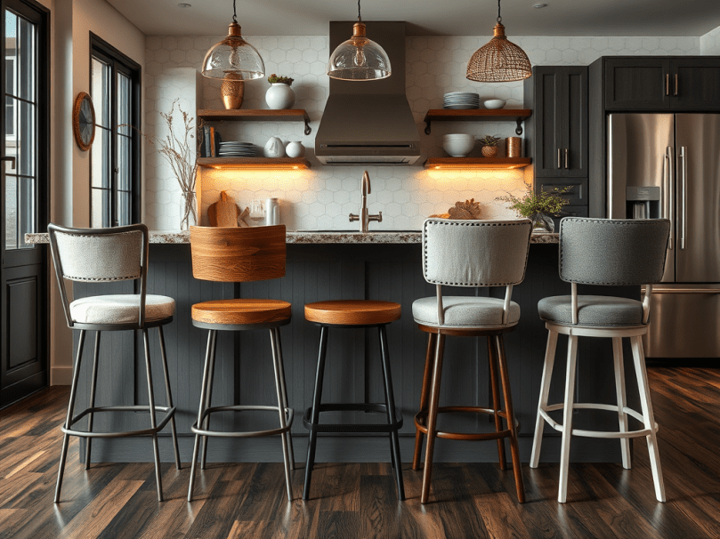 - Farmhouse: Wood stools, woven seats, distressed finishes