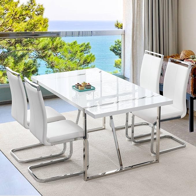 Investing in the right dining table set can transform your dining area into a space that is not only functional but also inviting and stylish. The 5-Piece Dining Table Set with a white rectangular MDF kitchen table and leather dining chairs is an excellent choice for those seeking a blend of modern design, comfort, and practicality. It’s a perfect fit for smaller spaces while still offering the quality and style needed to make your dining moments special.