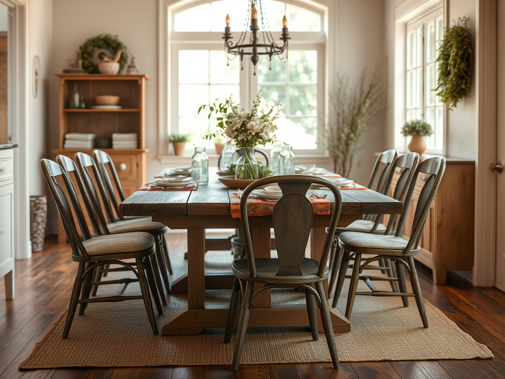 - The centerpiece of the farmhouse aesthetic. Look for tables with sturdy wooden tops, often paired with distressed finishes.