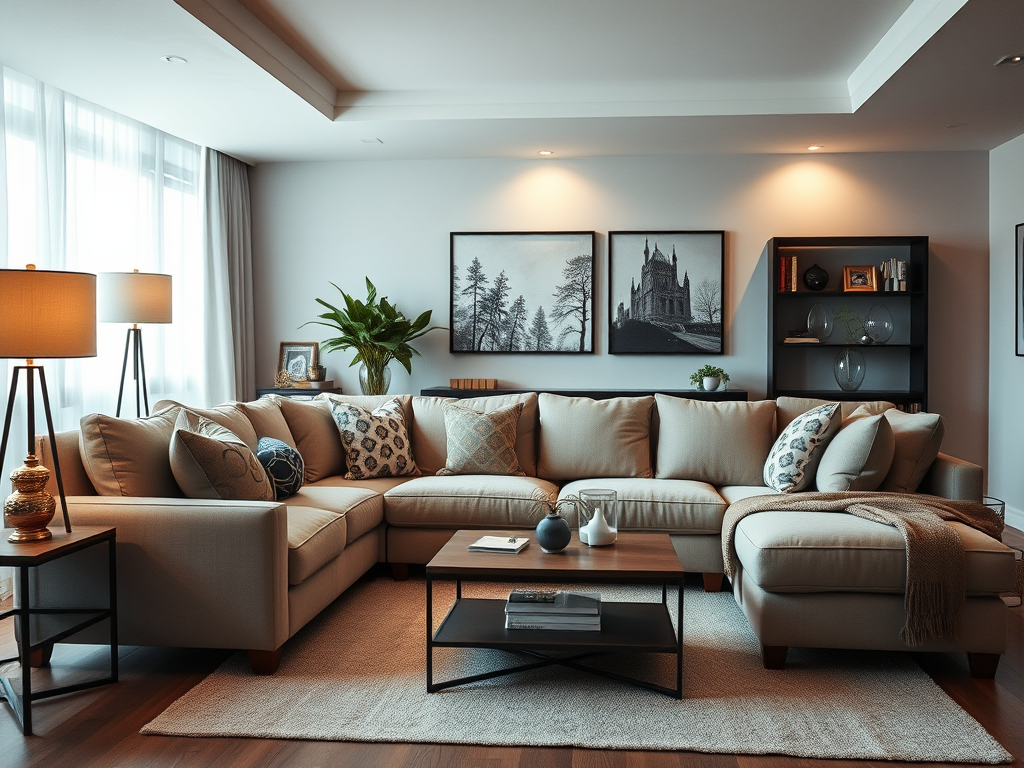 • Choose a sleek sectional with clean lines, often in neutral colors like gray, beige, or black. These sectionals pair well with contemporary decor.